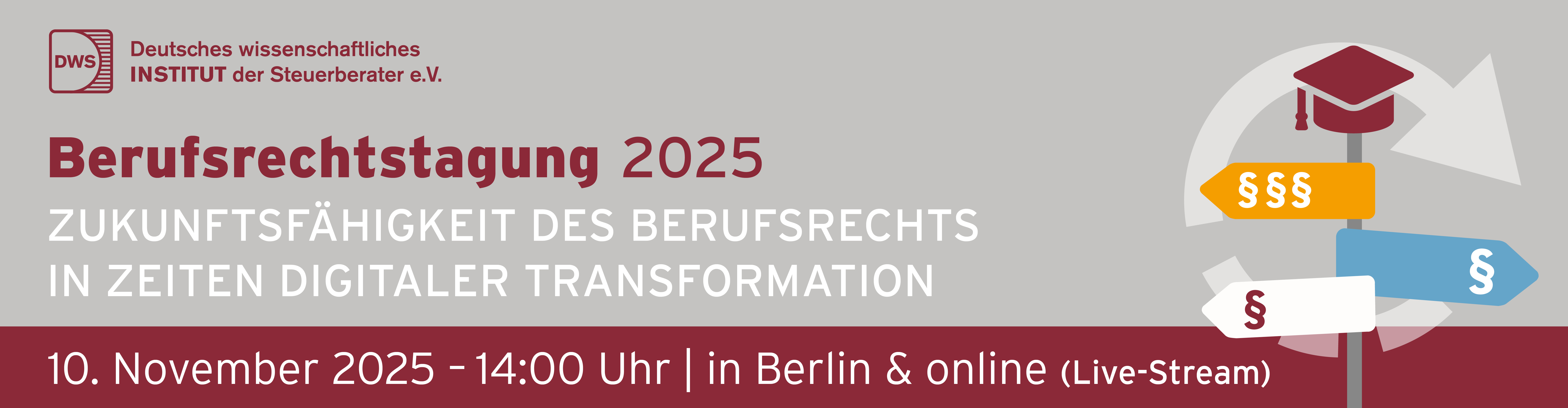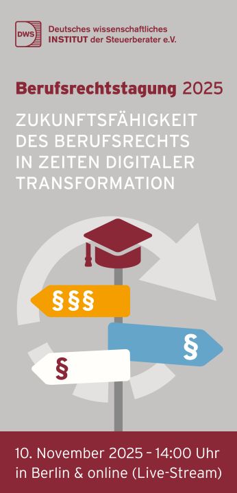Am 10. November 2025 lädt das Deutsche wissenschaftliche Institut der Steuerberater e.V. (DWS-Institut) zur Berufsrechtstagung mit dem Titel „Zukunftsfähigkeit des Berufsrechts in Zeiten digitaler Transformation“ nach Berlin ein. Interessierte können die Veranstaltung vor Ort oder im Livestream verfolgen.